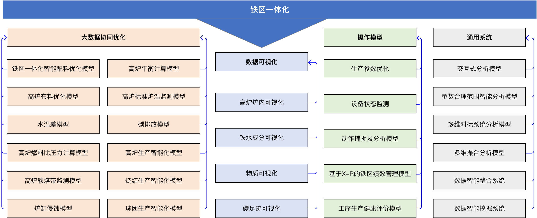 以煉鐵工序為例,解決方案針對鐵區生產的環境惡劣、效率偏低、智能化程度不足的問題,以高爐的穩定高效為中心,以原料、燒結、焦化、高爐的協同優化為目標,基于水土云工業互聯網平臺,貫穿鐵區原料、燒結、球團、高爐生產工序的數據鏈,通過建立鐵區一體化流程管控體系和多維度監控報警和推送機制,并結合深度學習算法在燒結點火、球團焙燒過程、高爐爐熱等關鍵操作點的工序生產過程狀態發展預測,實現鐵區可視化生產、數字化管理、自動化告警和智能化分析。