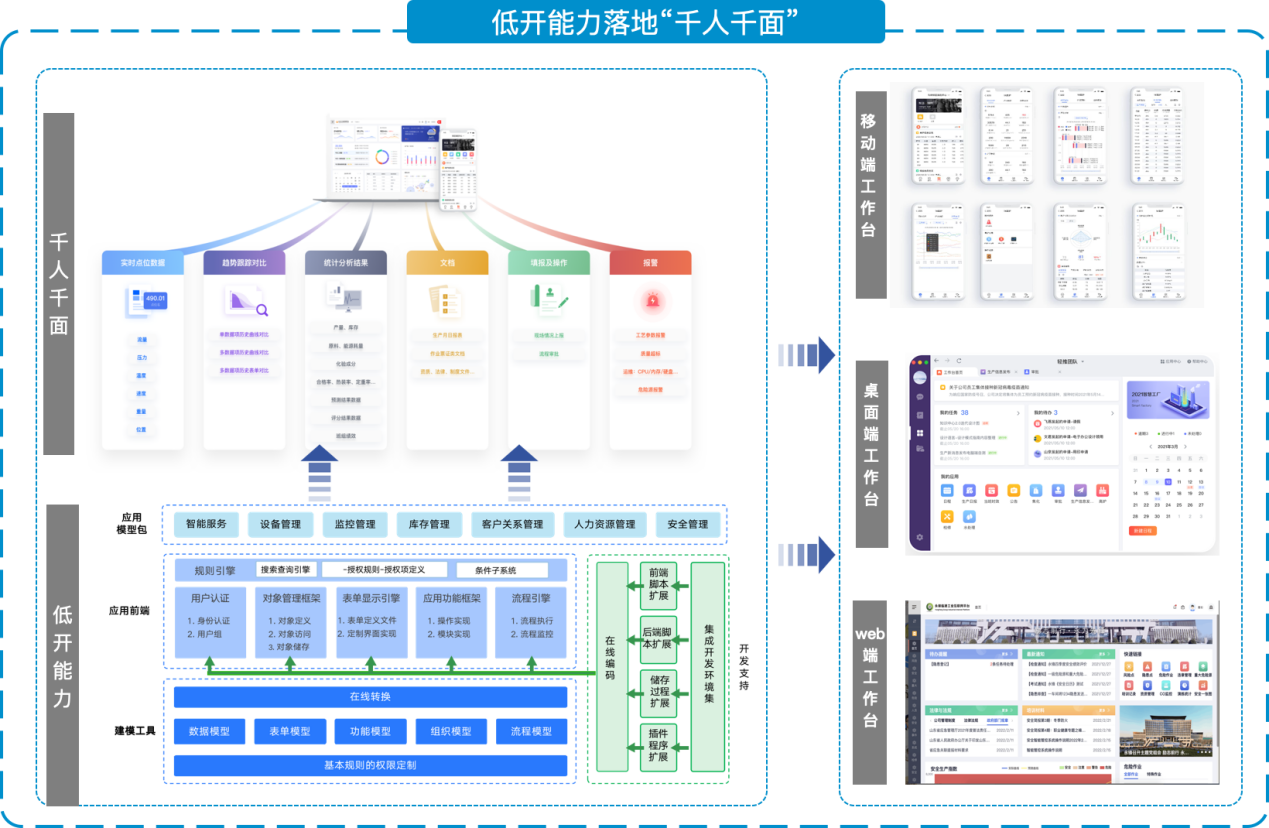 千人千面是水土云工業互聯網平臺針對流程工業企業流程長、機理復雜、工序崗位特點各異等特點構建的工業敏捷低開解決方案。通過組件選擇、拖拽、配置完成自定義業務的快速搭建,開放連接其他企業應用,為工業應用提供一種全新的高生產力開發范式。