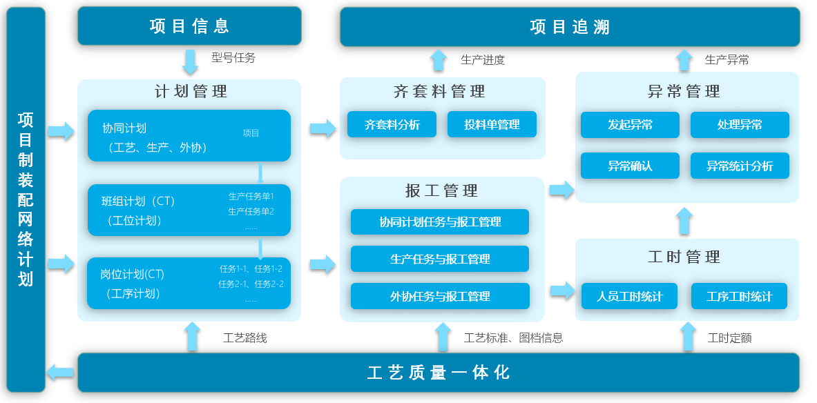 以單發產品的生產作為項目,通過單發總裝過程模型為網絡計劃控制主線,并貫穿于項目管理的整個過程;基于物料一物一碼的標識編碼原則,從項目的立項開始到項目結束的全過程,其工藝文件發布、物料齊配套、設備工裝配套、生產進程等方面實現項目的全方位管理,使單發產品在總裝過程中信息化、透明化,可視化,從而實現總裝生產的脈動式和單元式的靈活切換,達到進度可控、風險提前預警的管理要求,真正做到存在即可追溯。