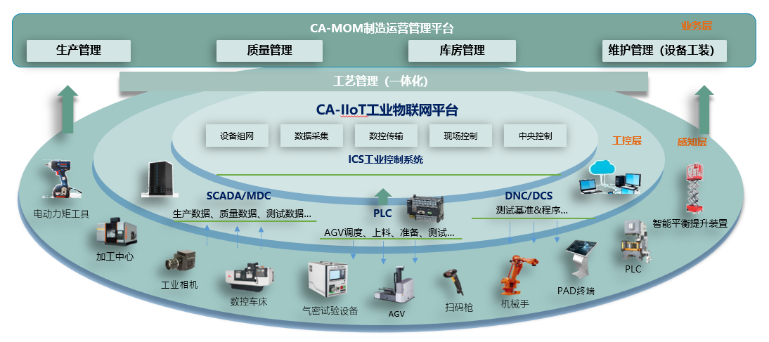 運用物聯網、邊緣計算、工業控制等先進互聯網技術,建立CA-IIoT工業物聯網平臺,實現設備組網、數據采集、數控傳輸、現場控制、中央控制功能;基于5G通訊技術實現生產線業務層人、機、料、法、環、測各要素的數據連接、數據感知、數據采集、數據傳輸、數據存儲以及控制指令的下發。