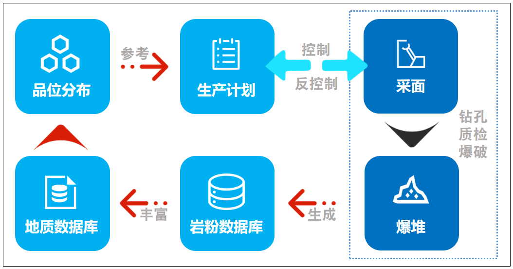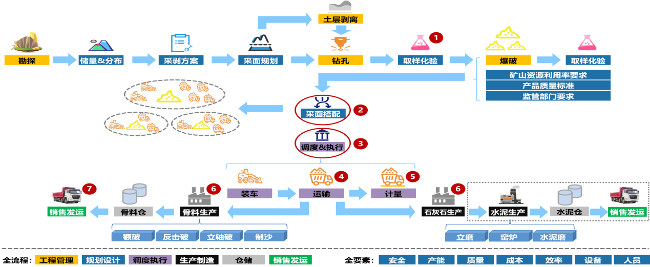 根據(jù)露天非金屬礦山企業(yè)的實際生產(chǎn)需求,結(jié)合行業(yè)痛點,通過對礦山穿、爆、裝、運、卸等各個生產(chǎn)環(huán)節(jié)長期跟蹤調(diào)研,全流程收集分析生產(chǎn)數(shù)據(jù),采用信息化、數(shù)字化、智能化手段,對礦山資源開采、生產(chǎn)計劃、爆破流程、車鏟調(diào)度、品位搭配、裝卸計量、安全管理等各個生產(chǎn)環(huán)節(jié)進行流程優(yōu)化與管控,解決傳統(tǒng)礦山數(shù)字化程度低、生產(chǎn)數(shù)據(jù)遺失、業(yè)務環(huán)節(jié)分散不互通的難題,實現(xiàn)礦山資源開采的數(shù)字化、安全生產(chǎn)的智能化以及智能管控的集成化。