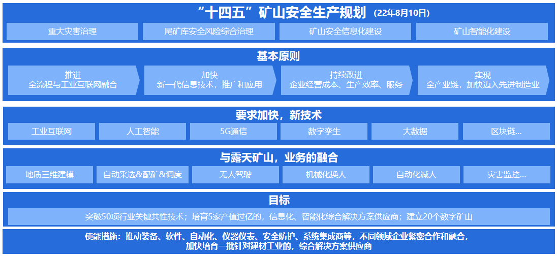 自2015年以來,國家及地方出臺多部智能礦山建設政策、指導意見及行業(yè)規(guī)范,其中包含《中國制造2025》、《砂石行業(yè)綠色礦山建設規(guī)范》(DZ/T 0316-2018)、《水泥灰?guī)r綠色礦山建設規(guī)范》(DZ/T 0318-2018) 、《河南省非煤礦山智能化建設實施方案(試行)》等,支持并積極引導煤礦及非煤礦山向智能化發(fā)展,同時,在科技、產(chǎn)業(yè)和金融等方面給與全方位支持。作為實現(xiàn)“雙碳”目標,助力礦山低碳、綠色發(fā)展的重要手段,政策明確推進礦業(yè)領域科技創(chuàng)新,加快建設數(shù)字化、智能化、信息化、自動化礦山,推進節(jié)能減排,將智慧礦山建設提升到新的高度。