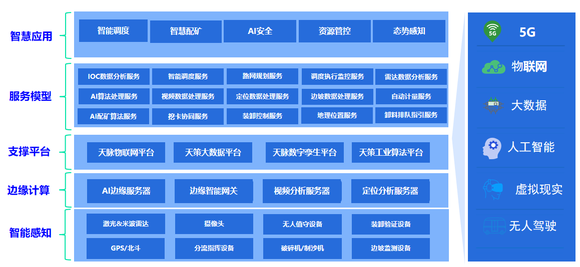 我們?nèi)诤?G、物聯(lián)網(wǎng)、大數(shù)據(jù)、人工智能、無人駕駛等前端主流技術(shù),通過天信工業(yè)互聯(lián)網(wǎng)平臺的物聯(lián)網(wǎng)平臺、大數(shù)據(jù)平臺、數(shù)字孿生平臺、工業(yè)算法平臺提供一系列服務模型,為智慧礦山頂層應用提供服務支撐。