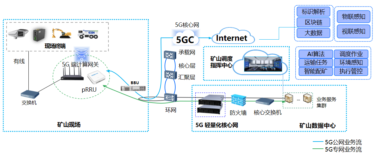 礦山開采現(xiàn)場采用5G網(wǎng)絡鏈接遠程挖機、無人駕駛車輛、工業(yè)采集網(wǎng)關等設備,通過工業(yè)環(huán)網(wǎng)數(shù)據(jù)傳輸至礦山數(shù)據(jù)中心為礦山調(diào)度智慧中心提供數(shù)據(jù)支持,同時通過互聯(lián)網(wǎng)鏈接云端標識解析、區(qū)塊鏈、大數(shù)據(jù)、AI工場等云端支持平臺。