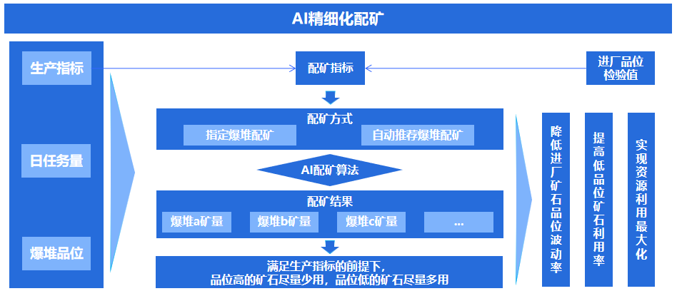 智能配礦:自研AI配礦算法,滿足配礦指標前提下,盡可能提高低品位礦石利用率,實現(xiàn)資源利用的最大化。