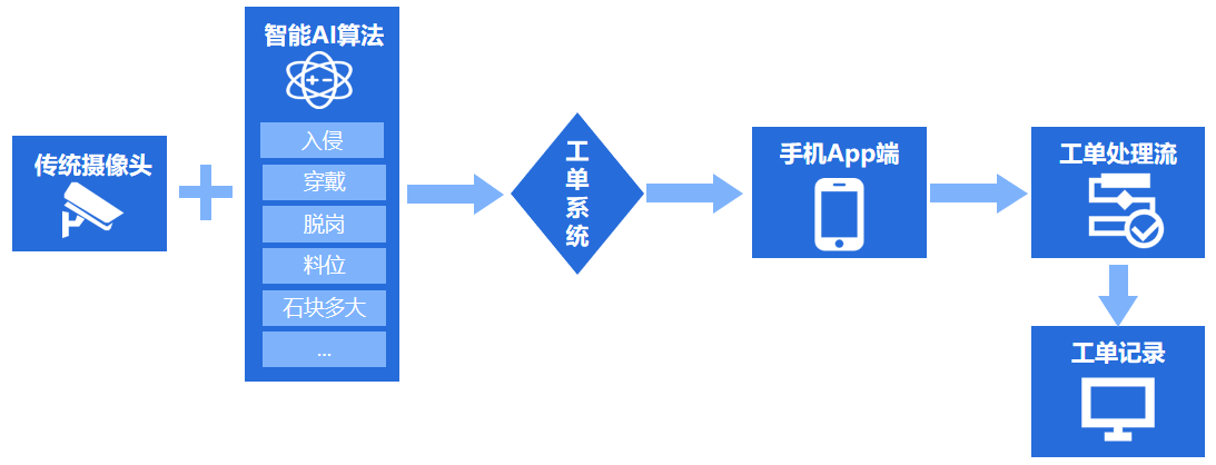 在原有監(jiān)控設備上部署 AI 識別算法,對高風險安全區(qū)域、重點生產(chǎn)區(qū)域進行情景識別,可實現(xiàn)對入侵、穿戴、脫崗、煙塵、料位、石塊過大等事件的精準識別,并與工單聯(lián)動,出現(xiàn)異常立即向相關人員手機端 App 推送工單,縮短響應時間,實現(xiàn)安全管理的智能化。