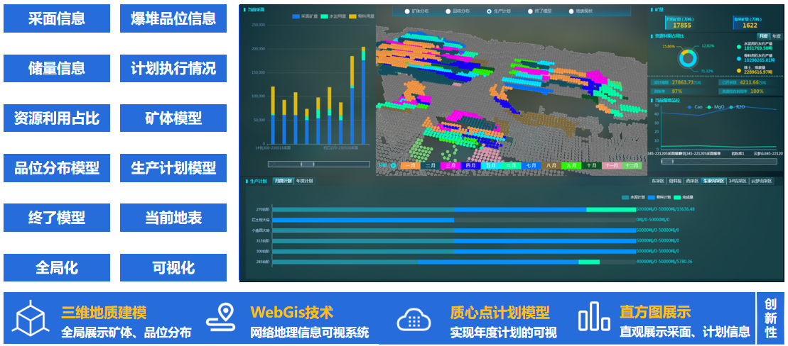 該系統(tǒng)可直觀展示品位分布模型、終了模型、年度生產(chǎn)計劃模型及年度、月度計劃執(zhí)行情況,并展示礦山儲量、資源利用情況,幫助礦山管理人員更直觀、全局的掌握礦山資源情況。