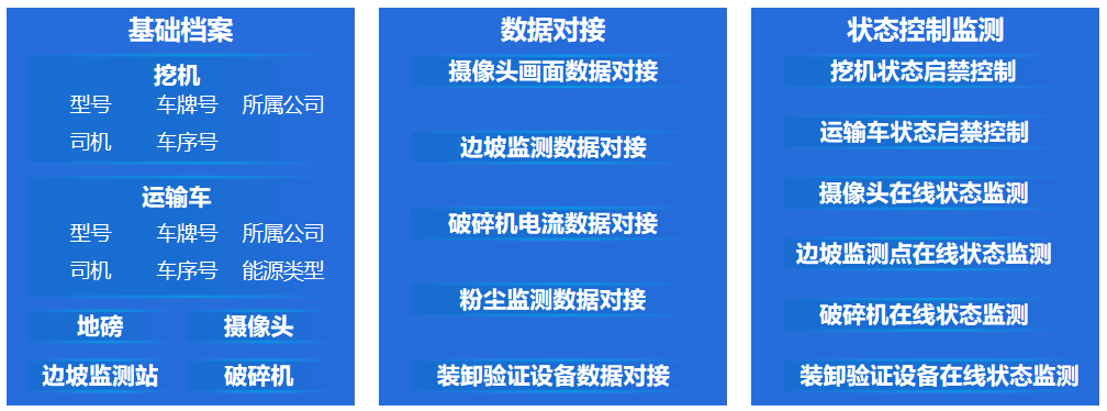 作為礦山生產(chǎn)及輔助生產(chǎn)設備的基礎檔案,如運輸車、挖機、破碎機、攝像頭、邊坡檢測點、裝卸驗證設備等,通過接口對接可實時展示設備的運行狀態(tài),并與工單聯(lián)動,出現(xiàn)異常立即向相關人員手機端 App 推送工單。