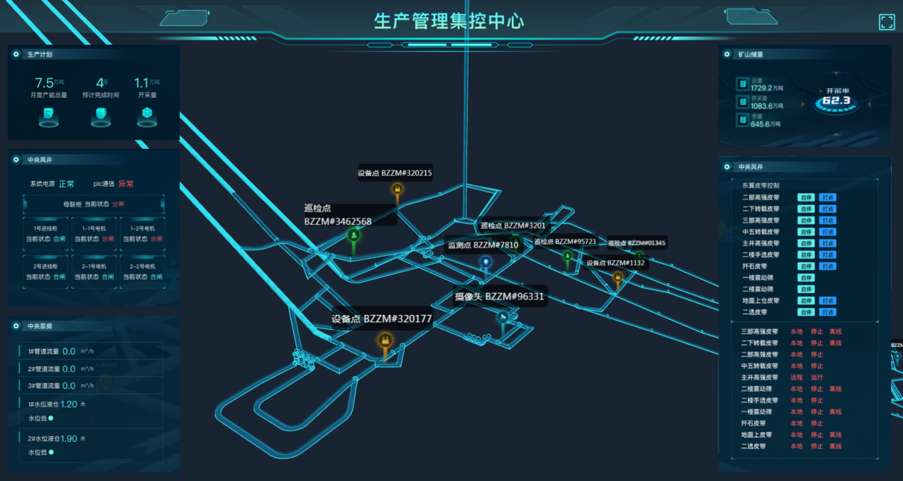 首頁 WebGis 地圖不只是三維設計初級階段的可視化模型,而是載有各類信息的數(shù)字綜合體,包括實時生產(chǎn)信息、車輛運行軌跡、采面信息、視頻監(jiān)控、邊坡預警信息等,實現(xiàn)了生產(chǎn)過程高度集成化的一張圖管理。