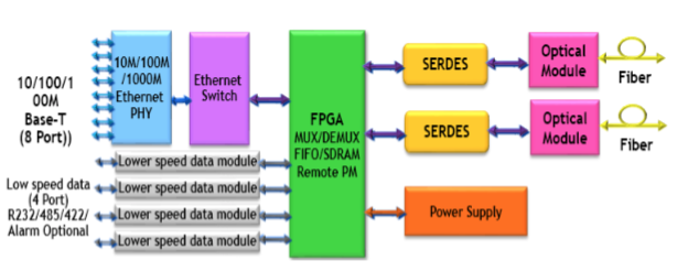 1)接入層設(shè)備根據(jù)端口數(shù)量不同分為多款。其信號處理原理相同,不同之處在于提供給用戶的以太網(wǎng)接口和低速數(shù)據(jù)接口的數(shù)量。低速數(shù)據(jù)接口可以靈活配置為RS-232、RS-485、通用輸入輸出接口GPIO、開關(guān)量或CAN-BUS接口。接入設(shè)備提供兩個上聯(lián)光口,速率1.25Gbit/s,可以和其它接入設(shè)備組成鏈形或環(huán)形網(wǎng),通過光纖再與中間傳輸層設(shè)備的下聯(lián)端口連接,實(shí)現(xiàn)接入層設(shè)備與傳輸層設(shè)備的互通。接入層設(shè)備功能框圖如下圖所示。