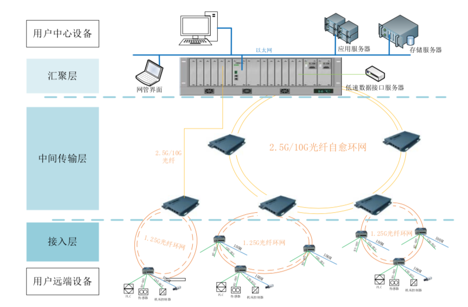接入層設(shè)備:連接用戶的遠(yuǎn)端設(shè)備,如傳感器、機(jī)床控制器、生產(chǎn)線機(jī)器人、網(wǎng)絡(luò)視頻攝像機(jī)等設(shè)備,把用戶的低速數(shù)據(jù)和以太網(wǎng)數(shù)據(jù)進(jìn)行時分復(fù)用后,轉(zhuǎn)換為光信號,通過光纖傳送給上層設(shè)備。反向完成光信號到電信號的轉(zhuǎn)換,時隙信息解析,把低速數(shù)據(jù)和以太網(wǎng)數(shù)據(jù)分別送給相應(yīng)用戶設(shè)備。