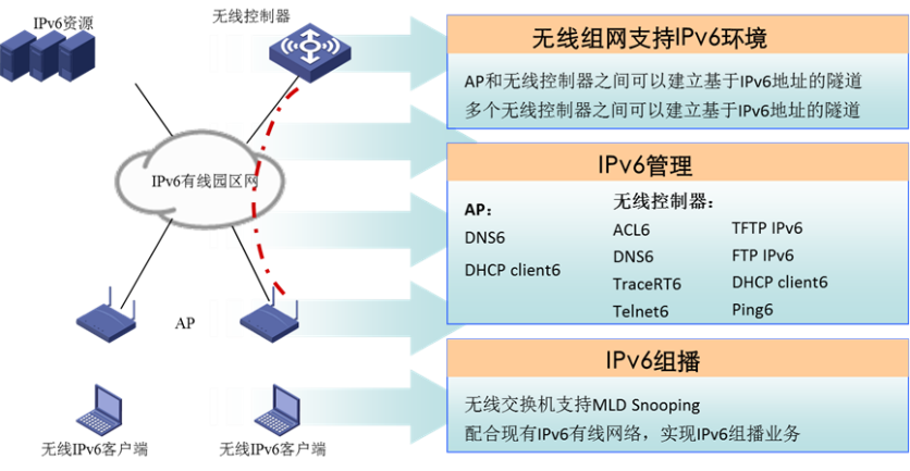 ? 支持ACL6、DNS6、Tracert6、Telnet6、TFTP IPv6、FTP IPv6、DHCP client6、Ping6實現IPv6有線無線網的同等管理。