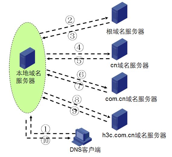 2)本地域名服務器接收主機客戶端DNS解析請求,從本地數據庫查詢域名對應的IP地址。如果從本地數據庫中查詢到對應的IP地址,則將查詢結果返回給主機客戶端;如果無法從本地數據庫查詢到對應結果,則本地服務器必須查詢其他的DNS服務器(類似于根服務器,二級、三級域名服務器),直到得到確認的查詢結果返回主機客戶端。