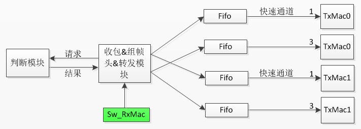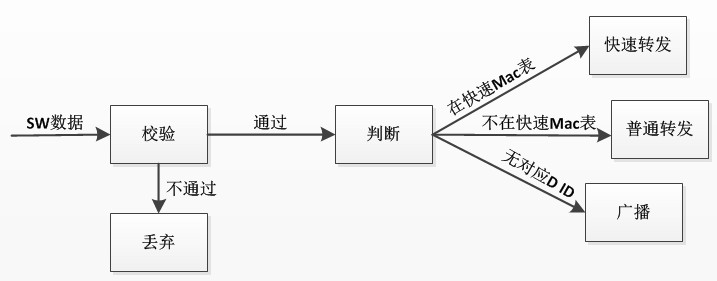 工作過程:SW模塊數據傳輸上來后首先會添加EOE私有幀頭,然后會對其進行校驗,校驗失敗,會丟棄此數據,校驗通過后,轉給判斷模塊,判斷模塊對私有幀頭部分進行判斷,來決定數據的去向。